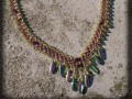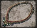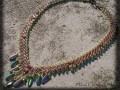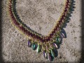 * náhrdelník šitý ze světle hnědého a zeleného rokajlu, obdelníčků a lístečků s kovovým efektem