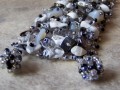 Náramek je šitý z černého, šedivého a průhledného rokajlu + rokajlu se stříbrným a šedomodrým průtahem. Je dozdoben šedými a černými skleněnými zlomky, zlomky hematitu, bílého howlitu a šedého achátu.